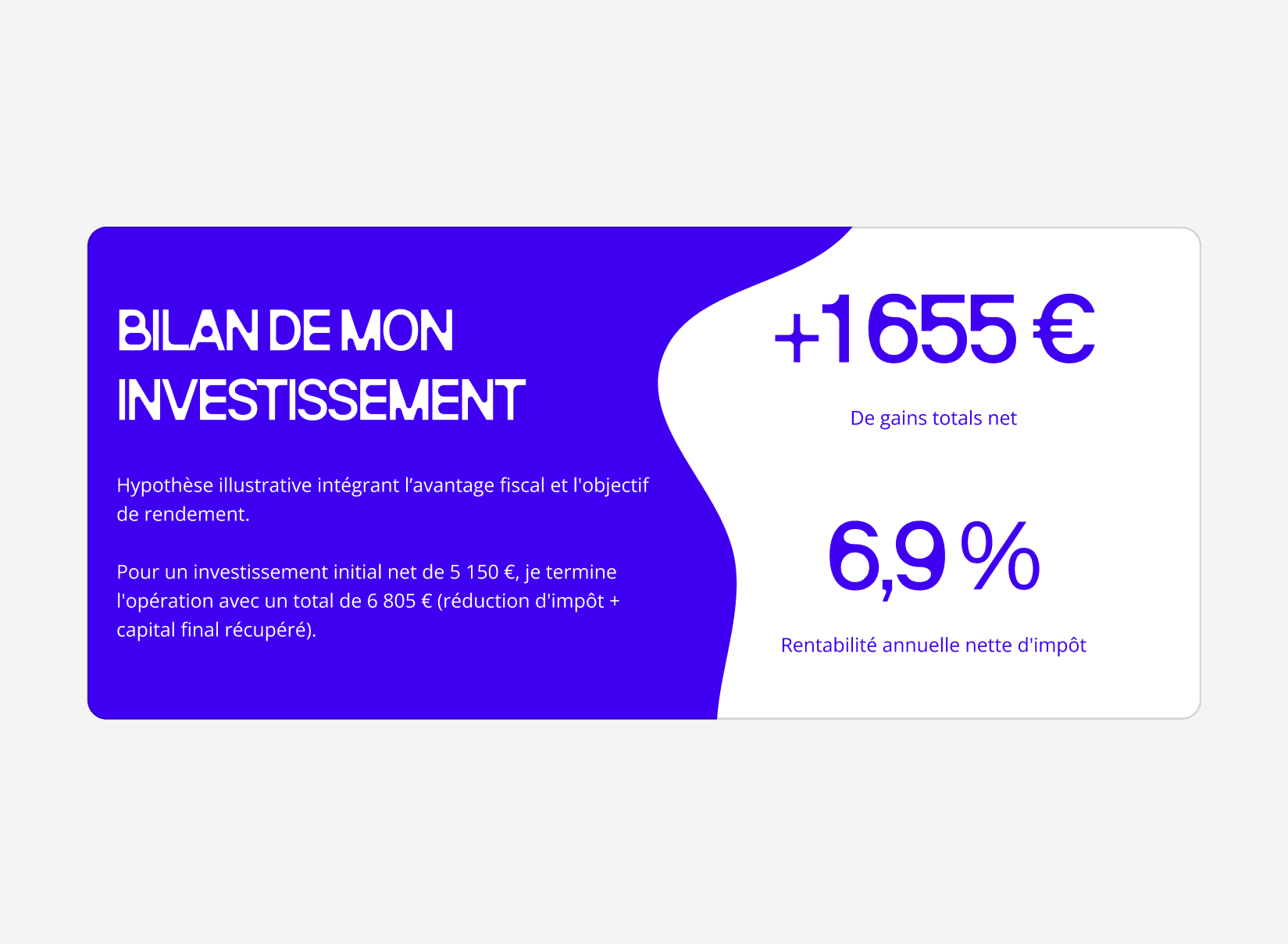 Concrete 5-year simulation: the investment section uses the same sticky-card mechanic to walk through "Année 1, Pendant 5 ans, and Après 5 ans" as progressive reveals