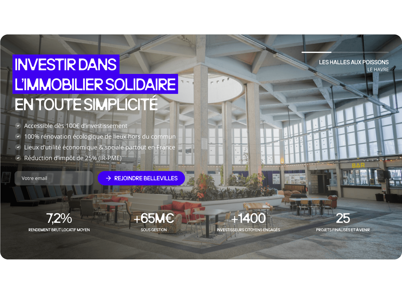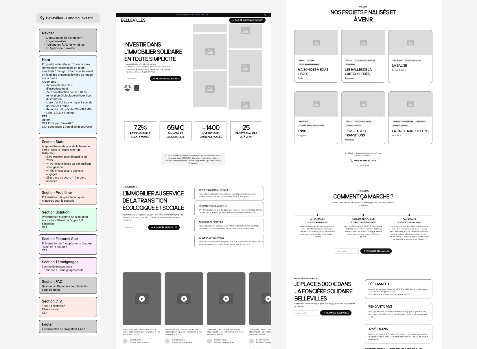 Bellevilles had a compelling proposition: invest from €100 in ecological real estate renovation, receive a 25% tax reduction, and support the social economy. But the existing page buried the lead. Potential investors had to work too hard to understand the mechanics, the returns, and why it mattered.