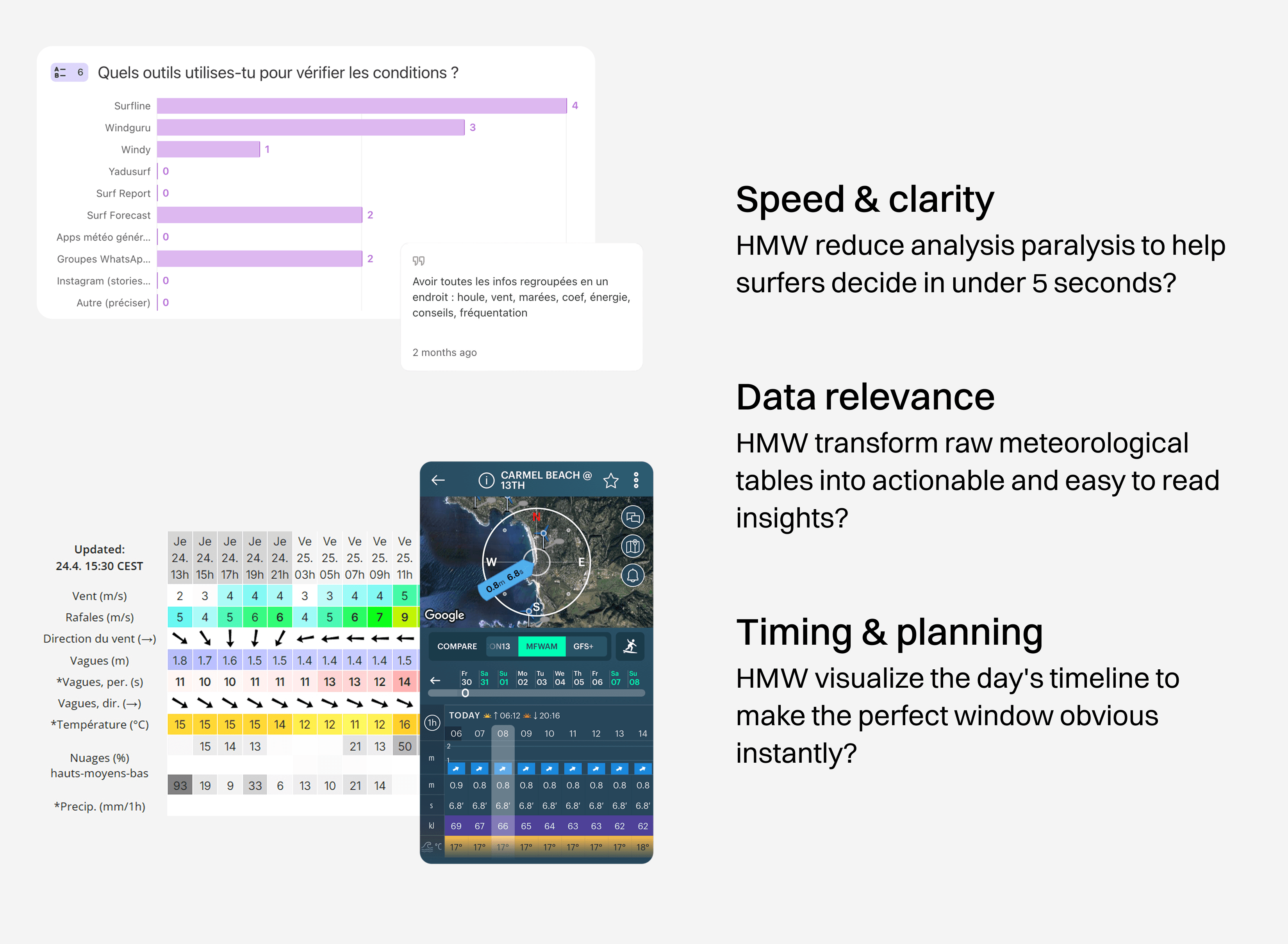 Through user interviews and Typeform surveys, we identified a critical friction point: Cognitive load. Surfers currently juggle between 3 to 5 different apps (wind, swell, tide, webcams) to make a single decision. This results in "analysis paralysis."